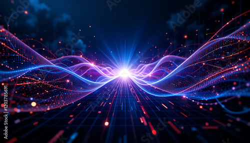 digital, wave, network, glowing, line, bright, future, technology, abstract, grid, particle, blue, purple, futuristic, energetic, light, movement, datum, connection, innovation, progress, modern, science, design, graphic, illustration, visual, effect, three-dimensional, rendering, computer, generated, background, wallpaper, image, neon, dynamic, cosmic, energy