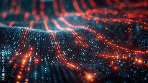 Abstract digital waves with glowing red and blue lights creating a futuristic and dynamic background. Perfect for tech and cyberpunk themes.