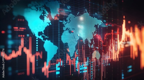 Abstract Digital World Map with Financial Data Chart Showcasing Global Economy and Technology