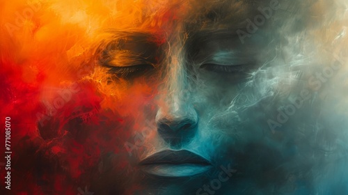 abstract, art, duality, serene, face, blending, warm tones, canvas, painting, texture, vibrant, abstract expressionism, modern, introspective, balance, contrast, fiery, artistry, contemporary, expressive, depth, gradient, harmony, meditation, emotion, creative, visualisation, artwork, symbolism