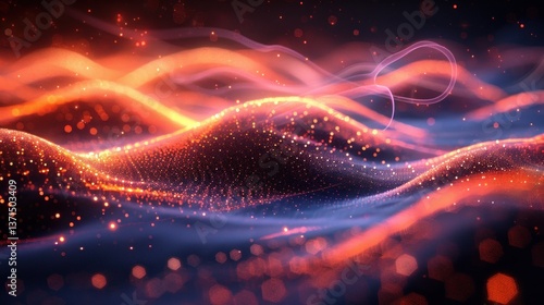 Abstract fiery waves, digital landscape, glowing particles, bokeh background