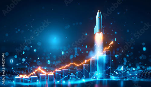 Abstract futuristic blue background with glowing arrows pointing upwards and a rocket taking off. Vector illustration symbolizing stock market growth or business success.