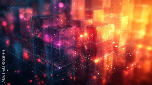 Abstract futuristic city, glowing cubes, network, vibrant lights