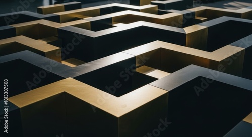 abstract, geometric, labyrinth, labyrinth, pattern, structure, interlocking, block, angular, gold, metallic, dark, grey, black, design, intricate, complex, three, dimensional, line, path, zigzag, modern, art, sculpture, installation, puzzle, challenge, connection, network, system, way, route, journey, direction, smooth, reflective, surface, light, shadow, perspective, depth, illusion, unique, striking, background, texture, detail, arrangement