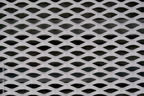 Abstract geometric pattern of a white expanded metal mesh with dark background
