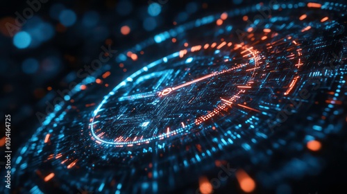 Abstract glowing circular interface with a red arrow in the center, blue and orange colors with a bokeh background.