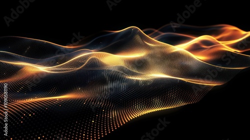 wave, abstract, gold, particle, energy, light, flow, motion, texture, background, digital, futuristic, technology, design, science, glowing, orange, dark, black, illustration, pattern, ripple, curve, dynamic, shiny, bright, elegant, luxury, modern, space, cosmos, network, connection, datum, virtual, three-dimensional, render, effect, style, artistic, creative, graphic, visualisation, concept, art, innovation, glow, sparkle, stream