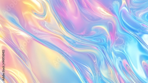 Abstract holographic iridescent background with pastel rainbow colors, fluid waves, and soft light for design or print presentation.