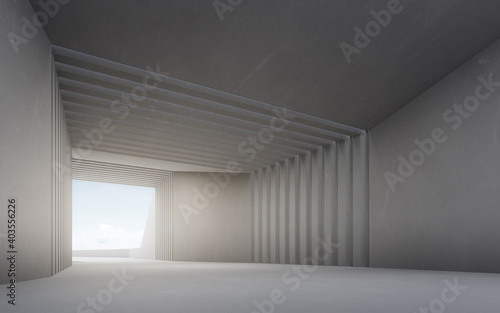 Abstract interior design 3D rendering of modern showroom. Empty floor and concrete wall with blue sky background.