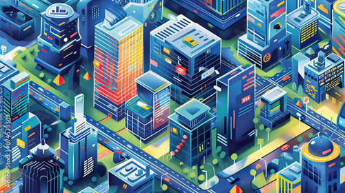 Abstract isometric illustration of a digitally enhanced cityscape featuring smart technologies such as IoTenabled devices online service platforms and green urban planning strategies