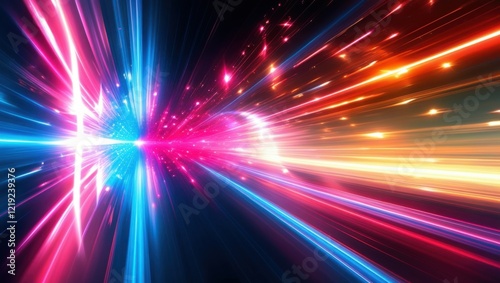 Abstract light trails, colorful energy beams, high speed motion, futuristic tunnel, neon colors, vibrant pink and blue, dynamic composition, sci-fi atmosphere, hyperspace effect, long exposure photogr