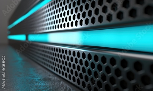hexagon, pattern, perforation, texture, geometric, metallic, steel, grid, blue, light, glow, modern, abstract, design, technology, computer, industry, industrial, surface, background, detail, perspective, chrome, shape, structure, futuristic, engineering, element, closeup, material, innovation, datum, server, hardware, computing