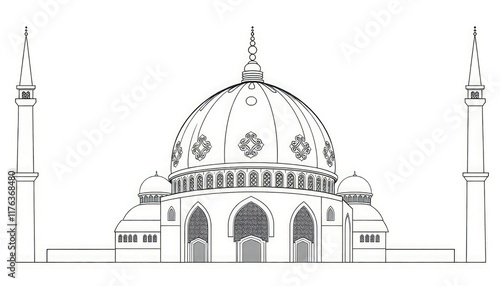 Abstract mosque dome with symmetrical ornamental details in a modern monoline style.