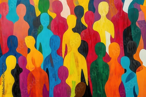 abstract pattern of overlapping stylized human figures in vibrant colors, representing diverse community unity through modern artistic interpretation