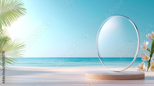 Abstract reflection of a blue, transparent bubble floating in the air, mirroring a tropical island with palm trees swaying beneath a vibrant sky