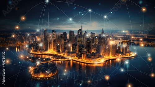 Abstract representation of digital business networks connecting through a virtual cityscape