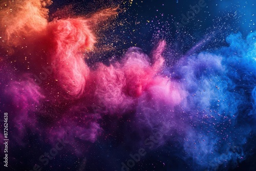 Abstract splashes of colorful powder on a black background with empty spaces for text, ideal for advertising festivals.