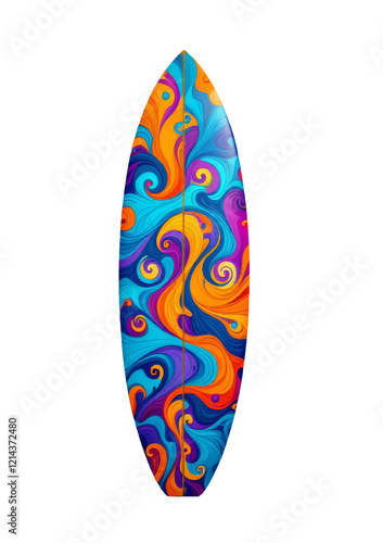 Abstract surf board with vibrant swirling colors in blue orange and purple on white background