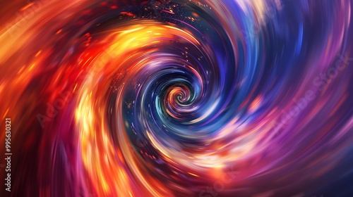 Abstract swirling vortex of orange, blue and purple colors with black center.