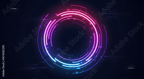 Abstract technology futuristic circles neon glowing blue and pink light lines with speed motion blur effect on dark blue background