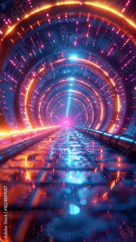 tunnel, light, glowing, abstract, reflective, surface, perspective, orange, blue, pink, future, neon, vibrant, corridor, path
