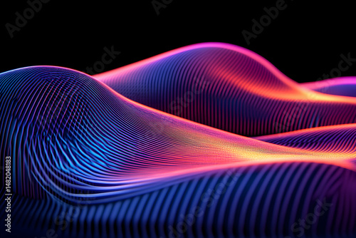 abstract, wave, neon, vibrant, colourful, digital artwork, dynamic, energy, futuristic, background, tech, texture, illustration, graphic, pattern, stripes, line, curve, smooth, glowing, light, dark, purple, pink, orange, blue, three-dimensional, render, artwork, wallpaper, design element
