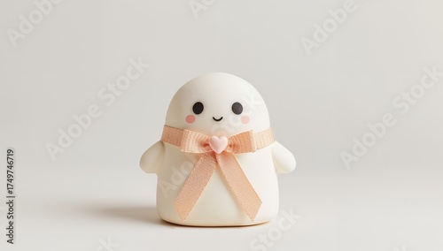 Abstract White Form with Pink Ribbon and Heart Adornment, Cute Shape and Minimalist Design.