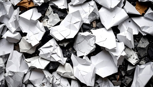 Abundance of shattered white shards contrasting starkly with dark, granular fragments evokes