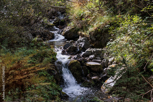 acqua fredda che scorre di giorno, in autunno tra le rocce ed i sassi di un ruscello di montagna, circondato da erba alta e piante varie
