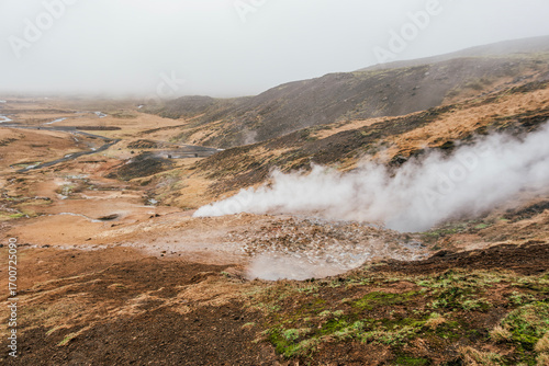 active, geothermal, area, iceland, steam, wind, hot, spring, gold, vale, landscape, volcanic, natural, water, rugged, hill, misty, atmosphere, nordic, field, fog, vapour, thermal, energy, power, geology, earth, underground, heat, bubbling, boiling, mud, pool, crater, sulfur, mineral, terrain, mountain, tundra, moss, green, brown, orange, autumn, overcast, cloudy, remote, wilderness