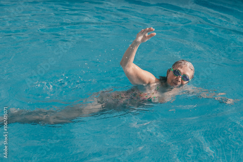 Active senior woman swimming freestyle in outdoor swimming pool under the sunlight wearing swimming goggles. Retirement and healthy lifestyle concept