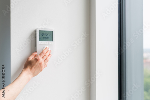 household, appliance, smart, home, thermostat, temperature, saving, energy, consumption, efficient, house, climate, control, panel, modern, device, digital, display, screen, central, heating, system, domestic, room, technology, living, space, bedchamber, air, conditioner, heater, thermometer, interior, design, apartment, contraption, solar, automated, humidity, humidifier, white, wall, adjusting, press, buttons, change, select, woman, hand