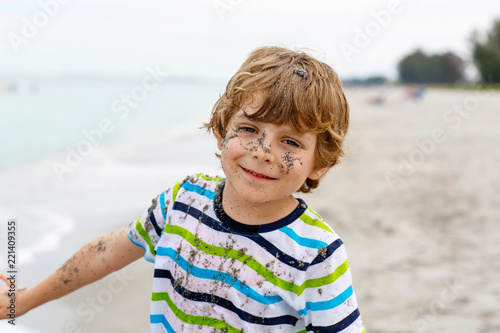 Adorable active little kid boy having fun on Miami beach, Key Biscayne. Happy cute child relaxing, playing and enjoying stormy warm day near palms and ocean. Kid with sand on funny beautiful face.