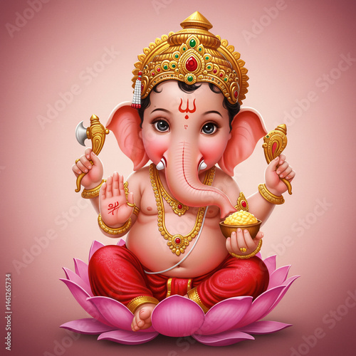 ganesh, baby, adorable, royals, attire, god, hindu, elephant, cute, lord, indian, crown, gold, jewellery, lotus, sweet, blessing, festival, religious, spiritual, art, illustration, digital, pink, red, culture, tradition, stock