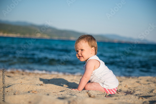 Adorable baby girl on sunny sand beach