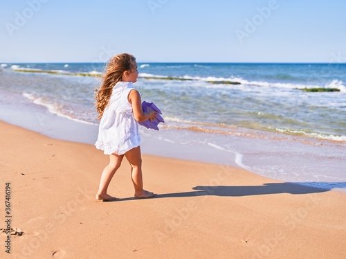 Adorable blonde child on back view wearing summer dress. Holding beach bucket at the sand