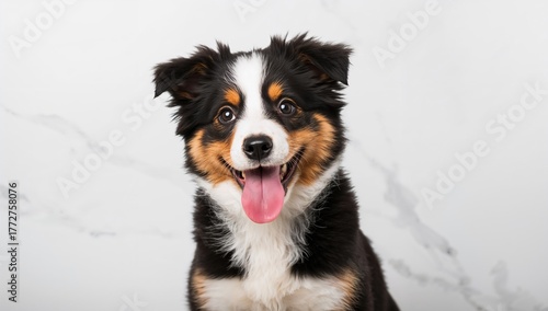 Adorable Border Collie puppy with long tongue extended against a white studio backdrop, emphasizing pet affection and responsible animal care