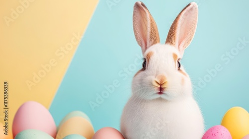 Adorable bunny surrounded by pastel Easter eggs; a springtime delight!