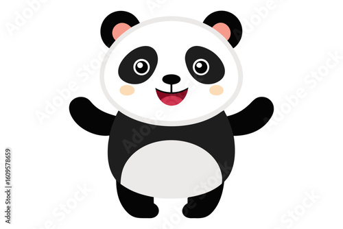 Adorable cartoon illustration of a standing panda with big round eyes, blushing cheeks, and a happy smile, set against a soft pastel background.
