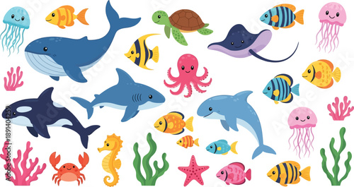 Adorable Cartoon Marine Animals and Vibrant Sea Life Collection, Featuring Various Ocean Creatures and Plants on a Clean White Background.