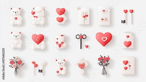 Adorable collection of love themed icons including cute teddy bears heart shaped keys and bouquets of flowers Ideal for Valentine s Day romance and relationship themed designs and graphics
