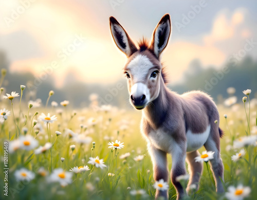 Adorable Donkey Foal in a Daisy Field at Sunrise