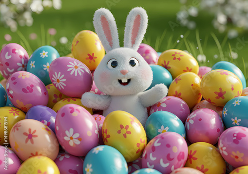 easter, rabbit, rabbit, egg, easter egg, spring, holiday, cute, adorable, happy, celebration, pastel, colours, flower, floral, design, graphic, illustration, three-dimensional, rendering, digital artwork, character, cartoon, whimsical, fun, joyful, festive, springtime, sweet, innocent, childlike, playful, vibrant, colourful, bright, yellow, pink, purple, blue, green, grass, nature, background, image, picture, photo, graphic design