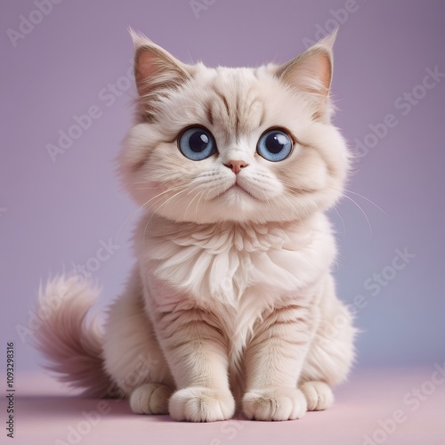 Adorable Fluffy Kitten with Striking Blue Eyes: A Close-Up Portrait of a Cream-Colored British Longhair Cat on a Soft Lilac Background