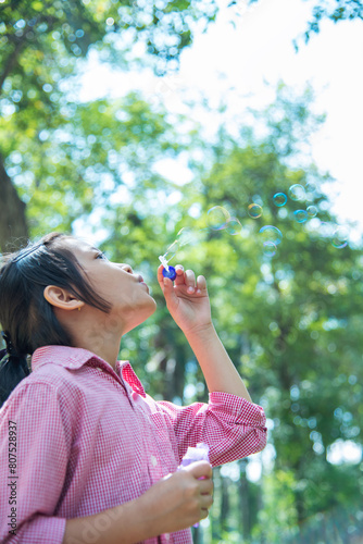 Adorable happy cute girl playful foam bubbles in green playground in summer outdoors. Funny Cheerful girl in the park with happy times.