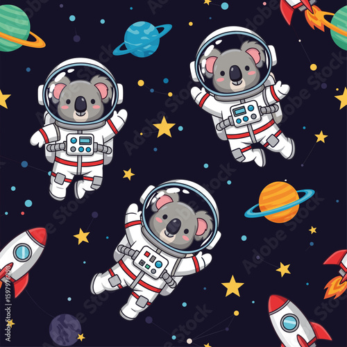 koala, astronaut, space, planet, star, rocket, cartoon, cute, adorable, illustration, seamless pattern, background, children, children, baby, design, textile, fabric, wallpaper, whimsical, funny, playful, vector, graphic, art, cosmos, galaxy, universe, outer space, adventure
