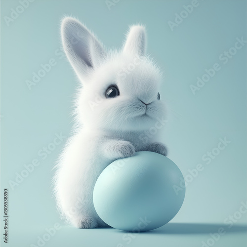 "Adorable White Baby Bunny with Light Blue Easter Egg on Soft Blue Background"