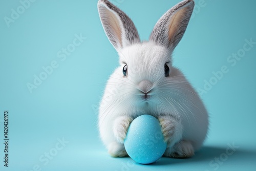 Adorable White Bunny Holding a Blue Egg with a Pastel Background