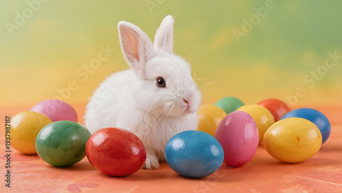 Adorable white bunny surrounded by vibrant colorful Easter eggs