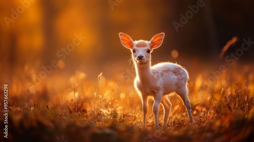 Adorable white fawn standing in a golden autumn forest at sunset, surrounded by vibrant foliage and soft light.
